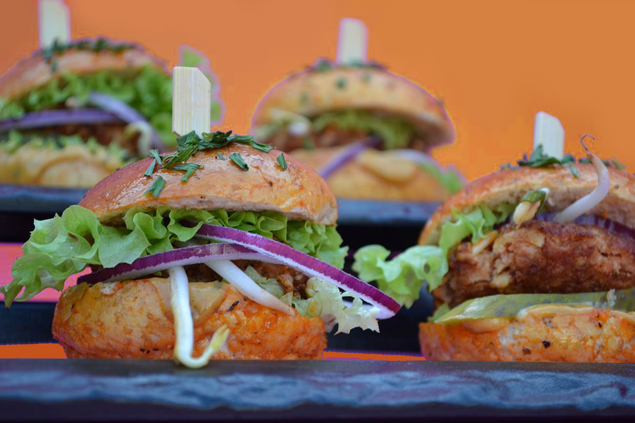Zacht broodje met burger gemaakt van soja en kikkererwten.