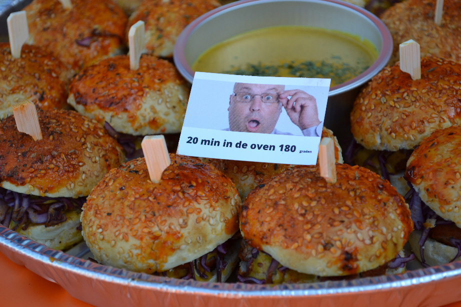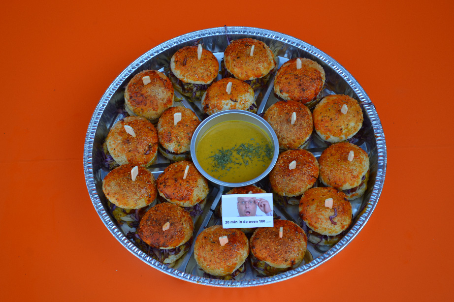 Belegde mini hamburgers geleverd in een ovenschaal.