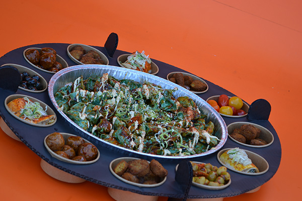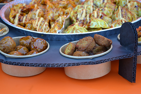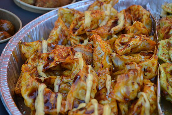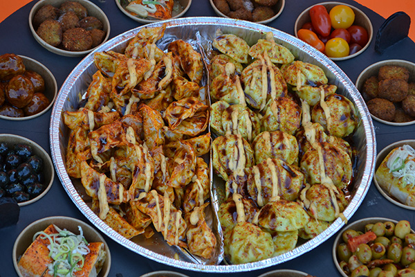 - Ovenschaal gevuld met dumplings met Beef – kerrie en teriyaki en Gyoza met kip en noodles.