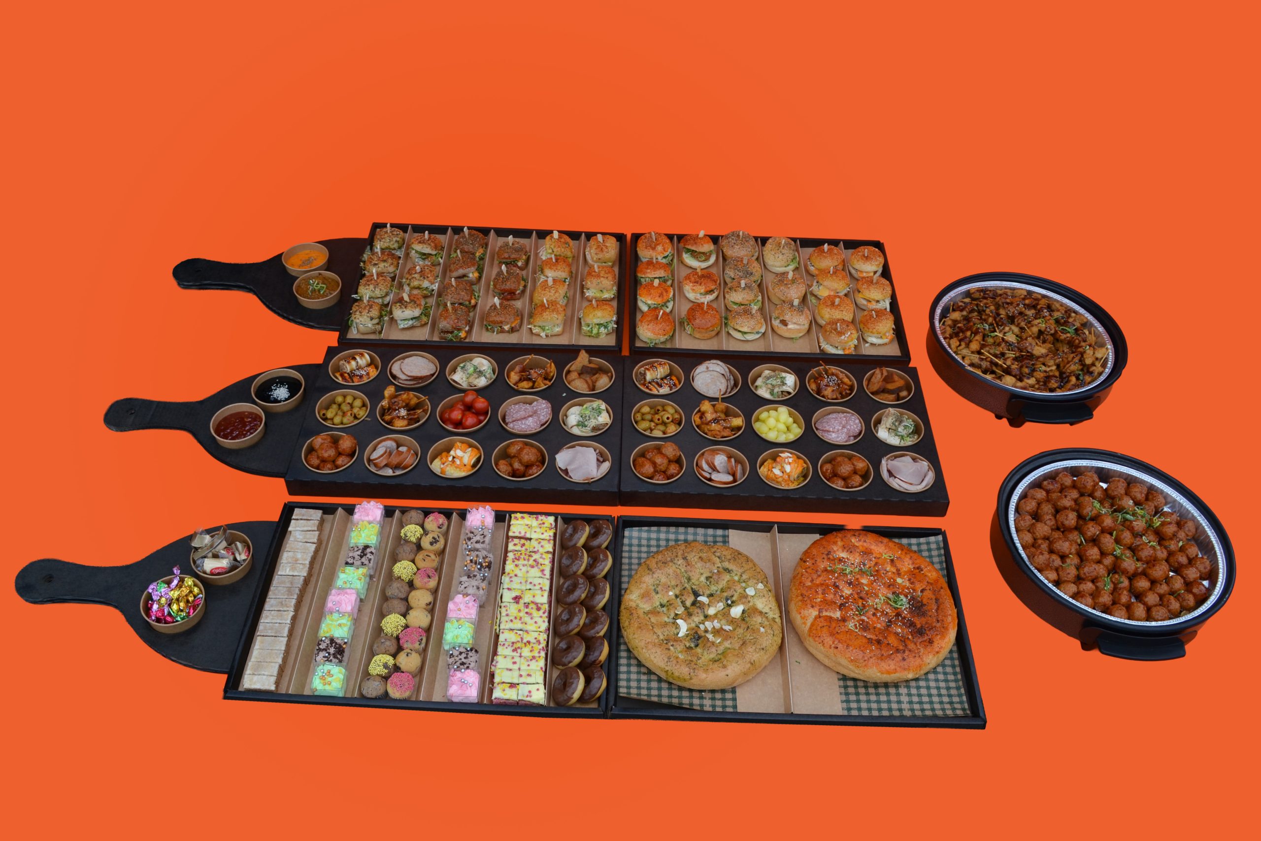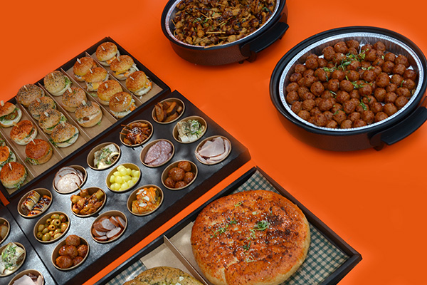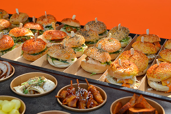 . 2 plateau’s met 7 mini cheeseburgers, 7 mini hamburgers, 7 min sandwiches, 7 mini bacon burgers , 7 tomaat mozzarella broodjes, 7 brie dille mosterd broodjes 42 broodjes ( niet verwarmen)