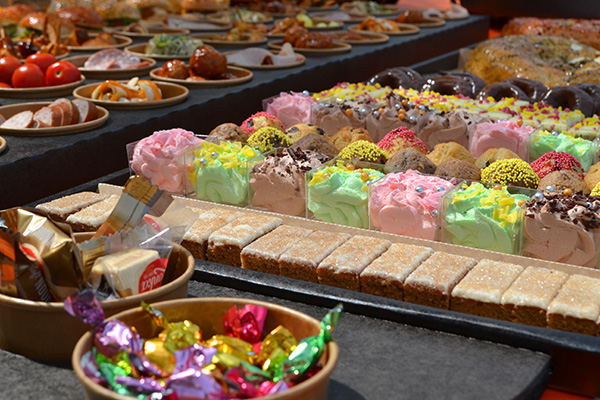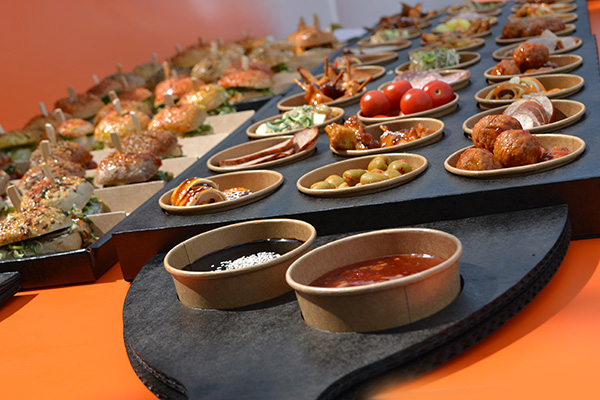 Bomvolle tafel met broodjes, zoetigheid, warme hapjes, koude tapas en meer!