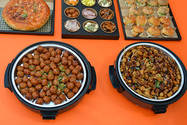 • 2 warme hapjespannen (pan warmt zichzelf op) gevuld met, gehaktballetjes (kip) en saté (kip) je hoeft niet perse de pannen te gebruiken de schalen zijn zeer geschikt voor in de oven. ongeveer 200 stuks