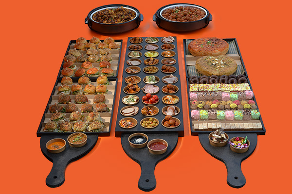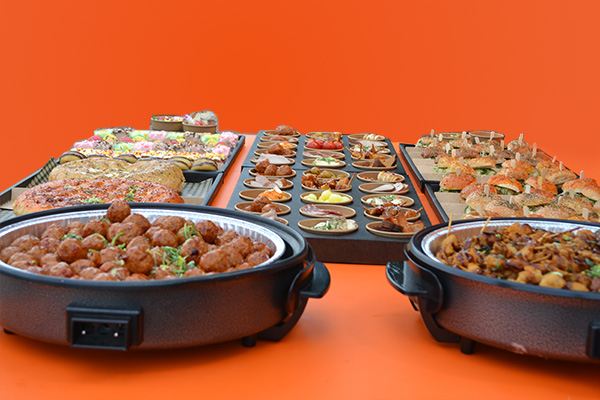 • heel veel koude hapjes wraps, gehaktballetjes , sate, olijfjes, chorizo, verschillende worstsoorten , spekkoek, dumplings, etc de samenstelling kan altijd iets wijzigen ivm bevoorrading versproduct.ongeveer 300 stuks