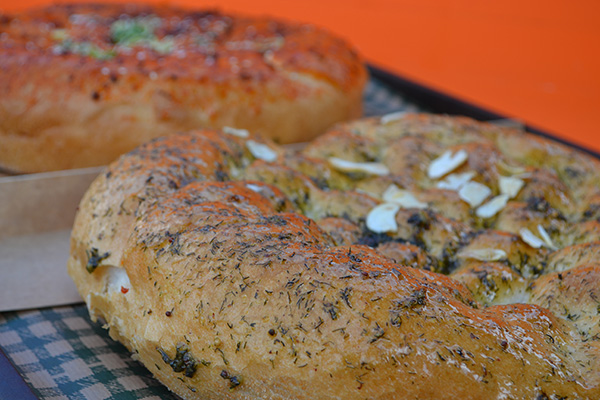 . een plateau met knoflookbrood en tomatenbrood en 2 lekkere sausjes (dip)