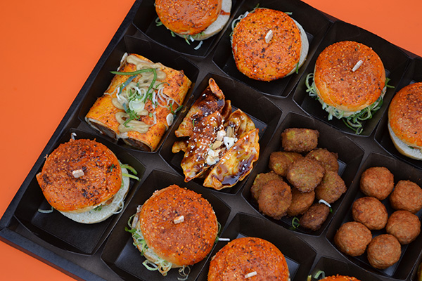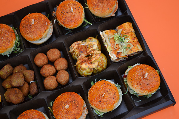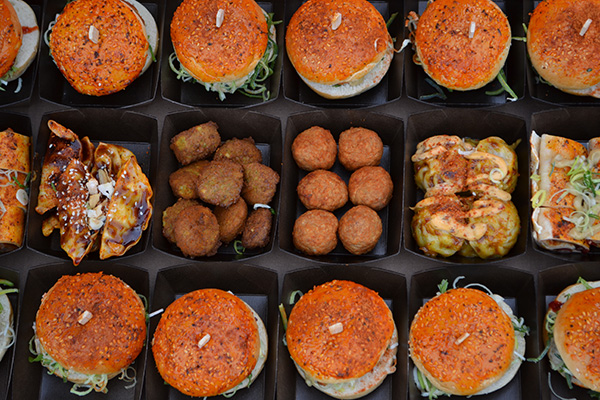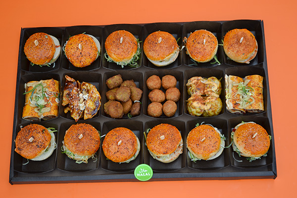 Groot plateau gevuld met halal hapjes en halal burgers!