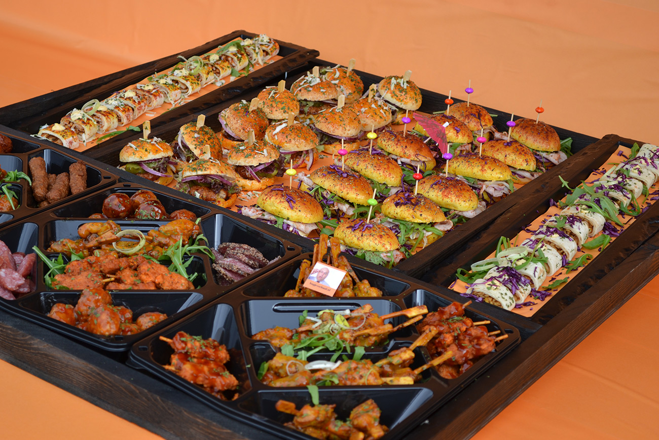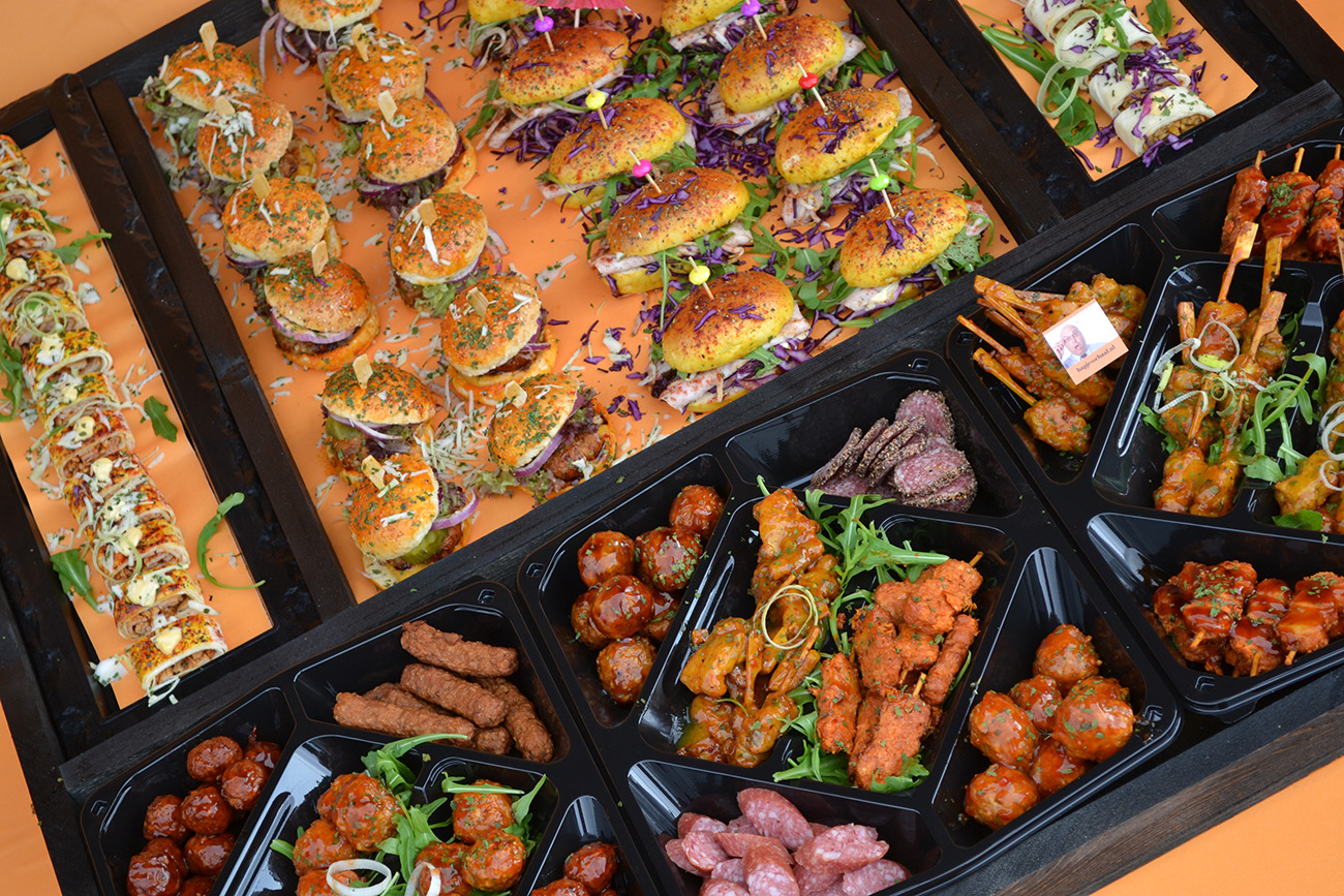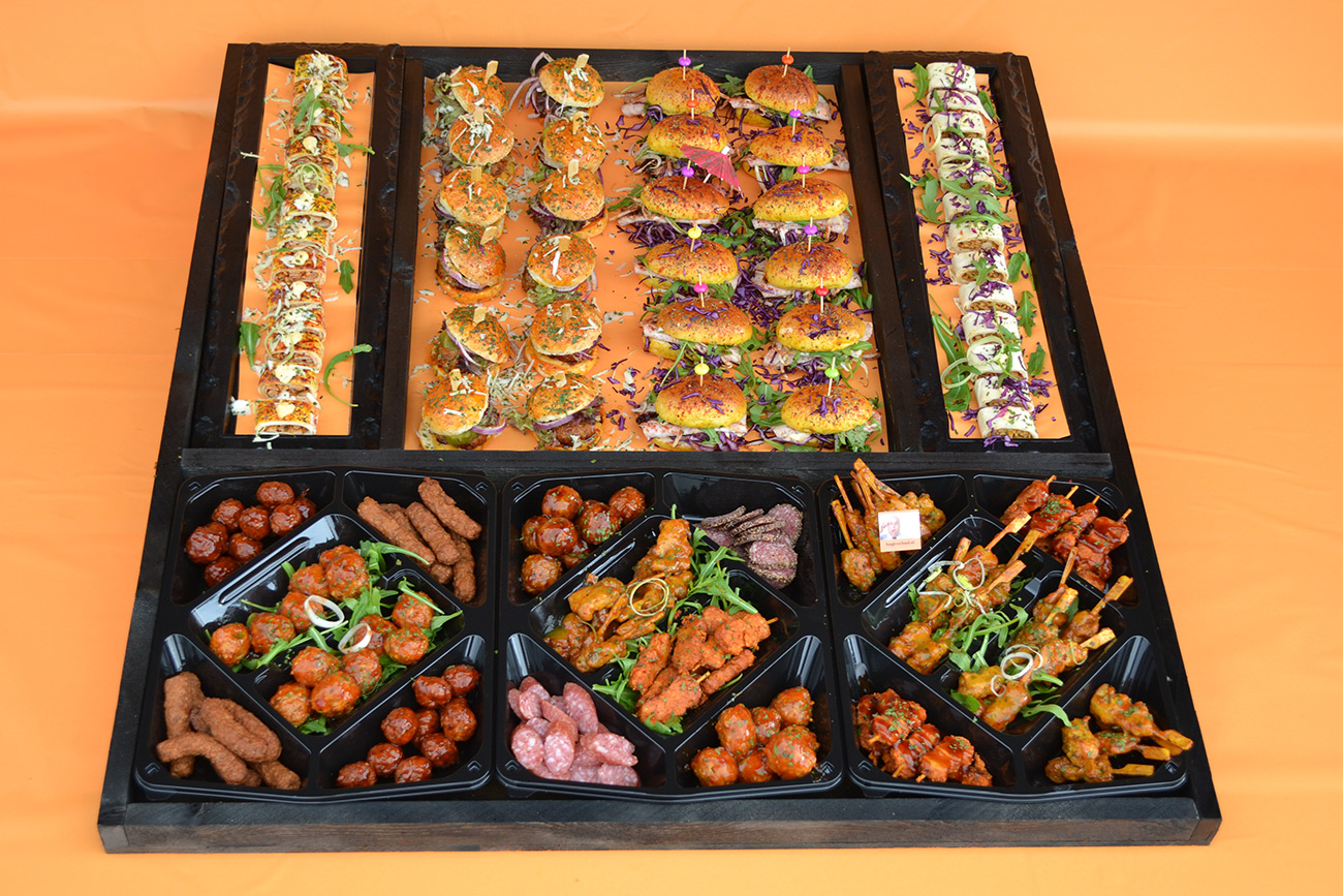 √ 12 mini hamburgers, √ 12 mini sandwiches, √ wraps, saté, balletjes en diverse andere hapjes.
