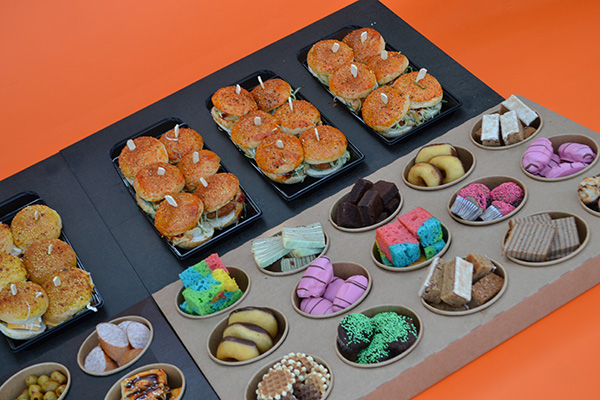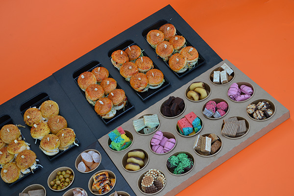 - 1 plateau met desserts zoals brownies, muffins, carrotcake, donuts, eclairs , wafeltjes etc..