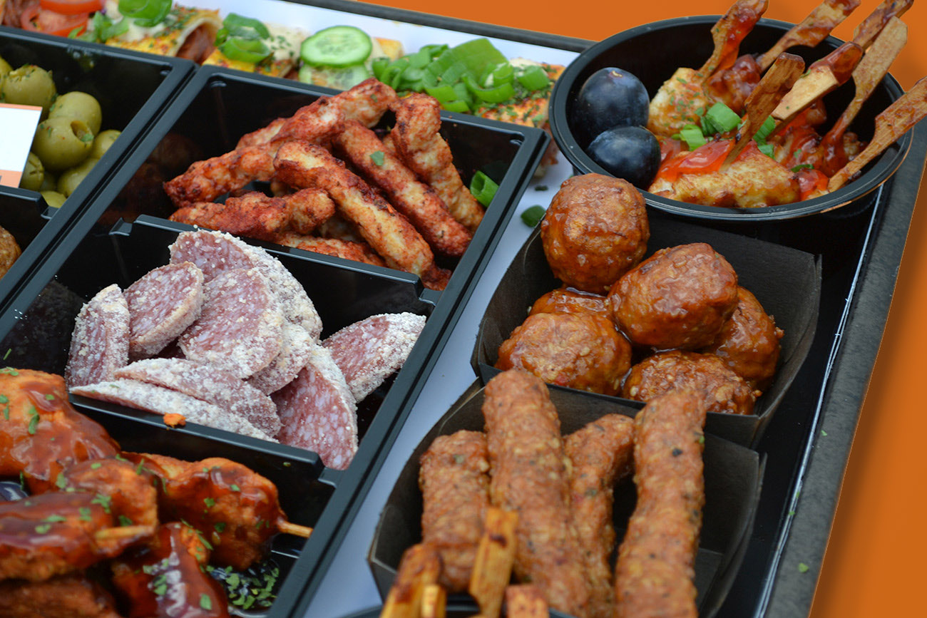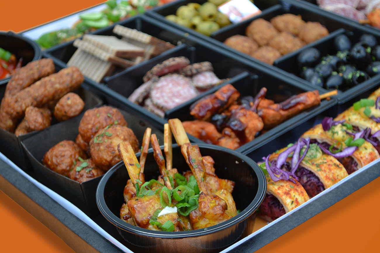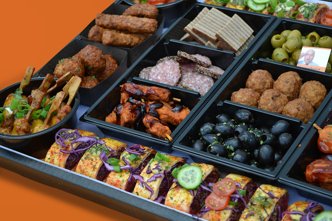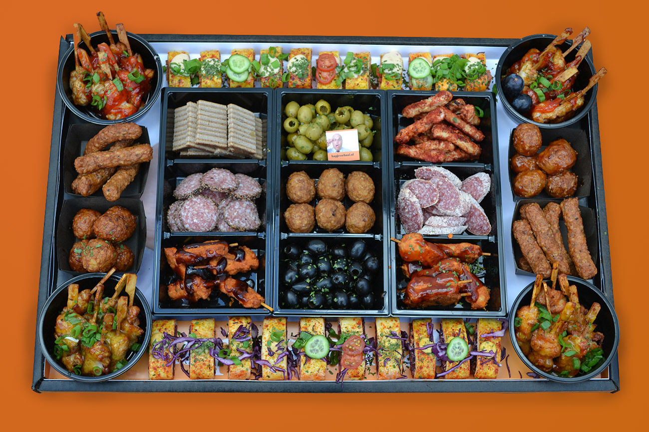 Deze schaal is gevuld met 4 verschillende soorten sate, gehaktballetjes, wraps, chorizo, olijfjes etc….