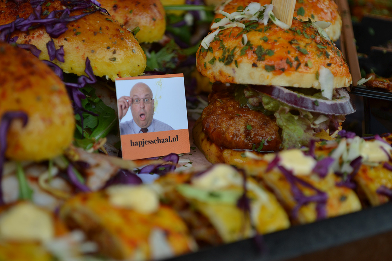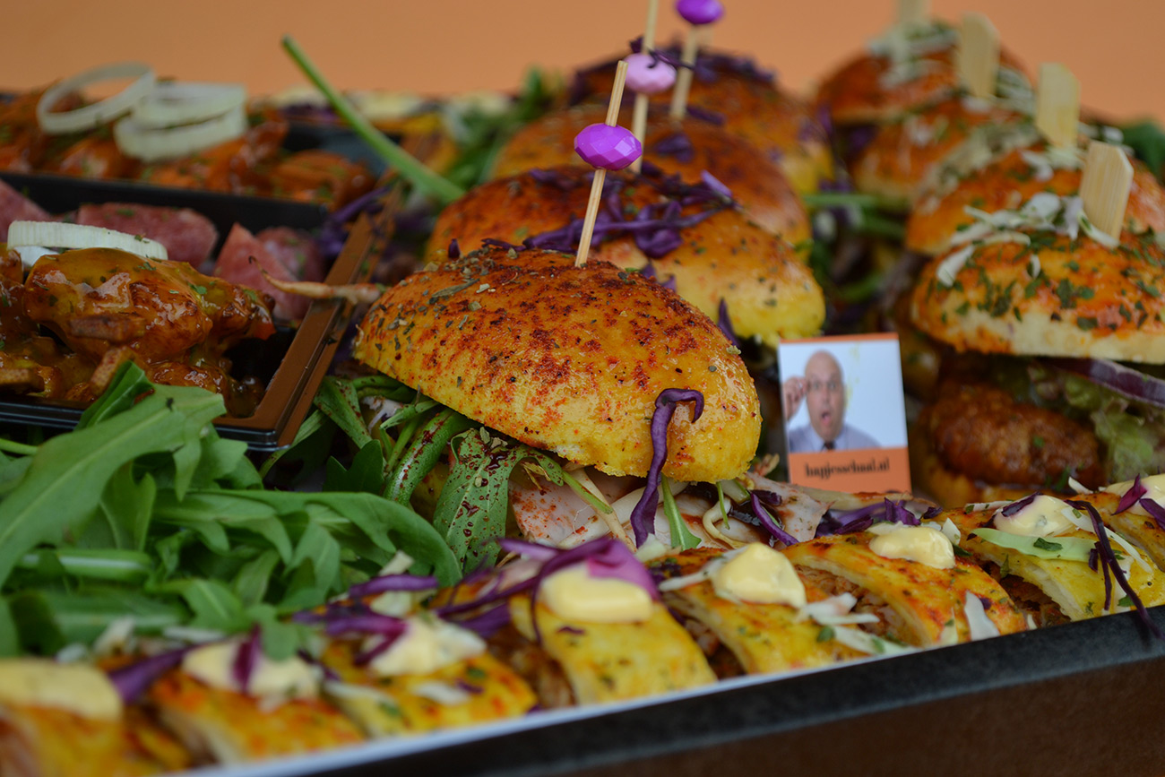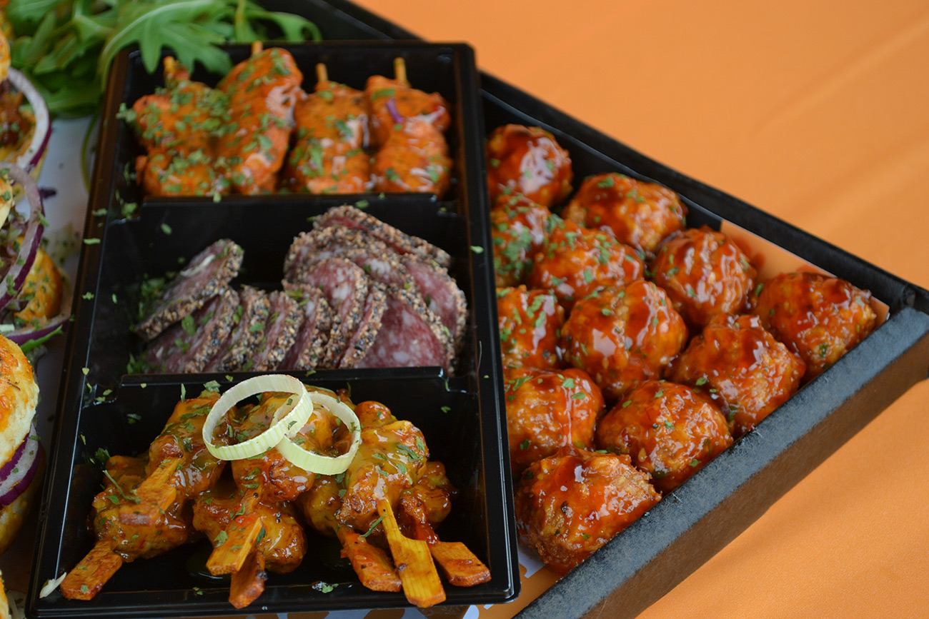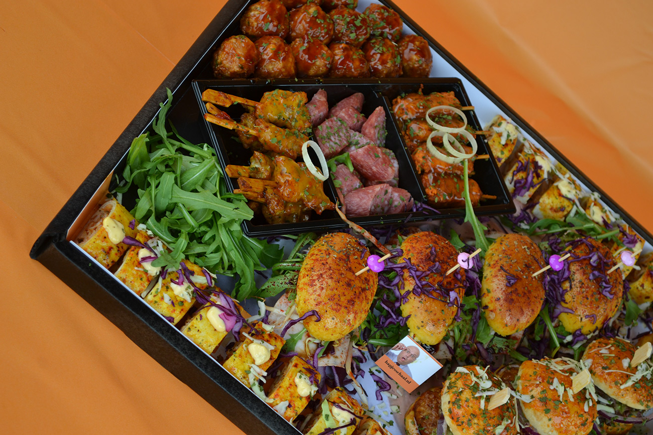 Gevuld met 4 mini hamburgers (eten op kamertemperatuur), 4 mini sandwiches, wraps balletjes, sate en chorizo.